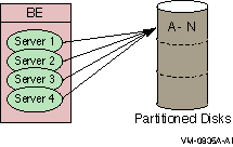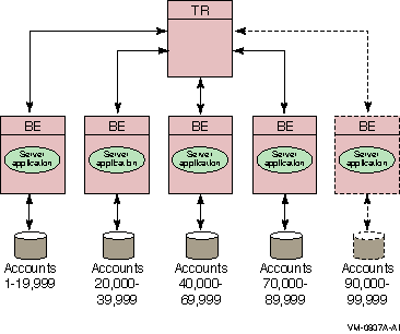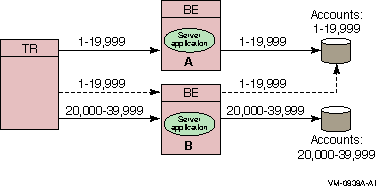 A significant advantage of the partitioning shown in the bank example is that you can add more account numbers without making changes to your application; you need only add another server and disk drive for the new account numbers. For example, say you need to add account numbers from 90,000 to 99,999 to the basic configuration of Figure 1-18, Bank Partitioning Example. You can add these accounts and bring them on line easily. The system manager can change the key range with a command, for example, in an overnight operation, or you can plan to do this during scheduled maintenance.