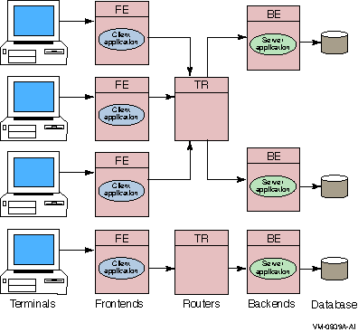 In addition to the physical configuration where RTR is deployed, software plays a critical part, extending the tier concept to more than three tiers. On certain pieces of hardware, client application software runs, and on others, server application software runs. Users can connect to nodes that are running the frontend role with appropriate non-RTR software. For example, a user can have a PC where RTR runs; in this case, the PC has the frontend role. Or a user could use a PC running, say Pathworks, to connect to another node that has the frontend role and run the RTR client application from there. This would be a multitier configuration.