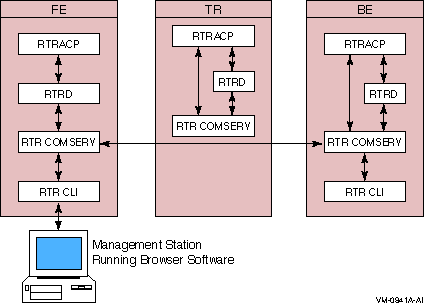 Figure 5-1 illustrates the RTR system management environment. While the figure shows the RTR Management Station on a node declared as a frontend (FE), you can manage RTR from any node where RTR is running, whether the node is declared as a frontend, router, or backend. The RTR COMSERV must be running to manage RTR. The RTR Management Station runs web browser software with which you manage RTR.