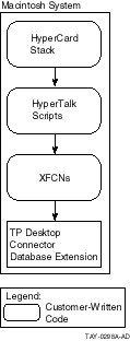 These external functions include the actual calls to the Data Access Manager (DAM) services supported by the TP Desktop Connector DDEV. Figure 8-5 shows the relationship among these various parts of a typical HyperCard desktop client program.