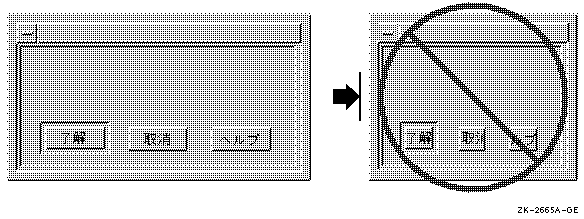 1次モード付きダイアログ・ボックスから祖先ウィンドウにポインタを移動させた際には, 使用アプリケーションがポインタを警告ポインタの形に変え, モード付きダイアログ・ボックスを画面から消去するまでは祖先ウィンドウでは何もできないことをはっきりと示します。 この警告ポインタは「進入禁止」を表わす国際的な記号です。図 1-2 は親ウィンドウで警告ポインタを表示した例です。