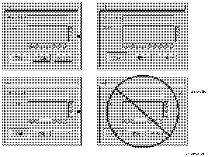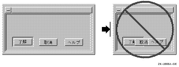 DECでは, 縮小に合わせてプッシュ・ボタンが移動するルーチンDXmFormSpaceButtonsEqually を提供しています。詳しくは,第1.3節を参照してください。