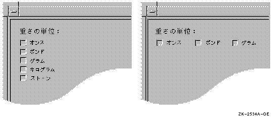 ダイアログ・ボックスは見やすい構造にするために,スペースまたはbevel を使用して関連する選択肢をグループ化します。bevel(ベベル)とは, 各グループの周りに使用する3次元のボックスまたはフレームのことです。 図 1-24に例を示します。グループ化をするために, 左のダイアログ・ボックスではスペースを使用し,右のダイアログ・ ボックスではbevelを使用しています。