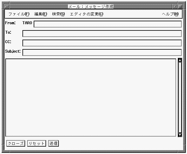 同じシステム上または他のシテスム上のユーザにメール・メッセージを送信するには, メイン・ウィンドウの「作成−送信」ボタンをクリックします。 「メッセージ作成」ウィンドウがオープンされます。図 6-14 に「メッセージ作成」ウィンドウを示します。