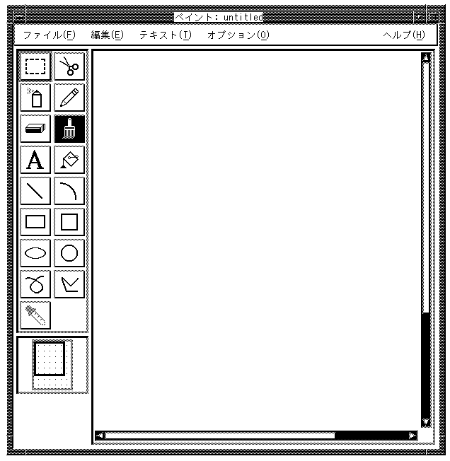 「ペイント」ウィンドウがオープンされて,そこに絵を描くツールの一覧(" ツール・パレット"と呼ぶ)と作業領域が表示されます。図 6-16 に「ペイント」ウィンドウを示します。
