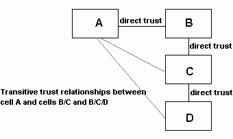 · No more than one direct trust peer relationship can be traversed by a transitive trust relationship. (A direct trust peer relationship is a direct trust relationship between cells that are neither ancestors nor descendants of each other in the naming hierarchy.)