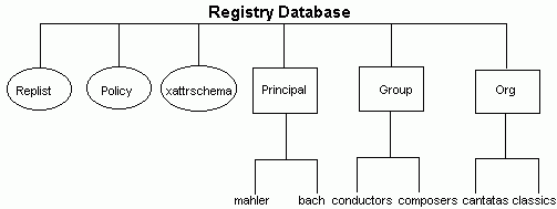 The permissions that are granted to objects in the registry depend on where the object fits in the structure of the registry database. The following figure illustrates the registry database. The