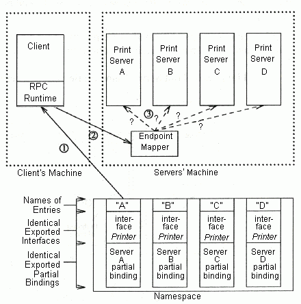 The entry names are different, but the partial binding information contained in the entries is identical, since the servers' host machine is the same. The interface UUID included in the call is no help, since that same interface is offered by all the servers. A client seeking a print server may not care to which server (and thus to which printer) its request goes, but then again, it may care. If it does, there is a way it can specify a server so that the endpoint mapper can select an appropriate endpoint to complete the partial binding.
