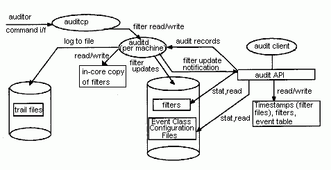 The audit management interface (accessed through the DCE control program) is used by the systems administrator to specify who, what, when, and how to audit. This is accomplished through the use of the filters. The audit daemon maintains the filter's information in its address space. The filters are also stored in local files so that the filters can be restored when the machine restarts, and so that audit clients can read the filter information from these files.