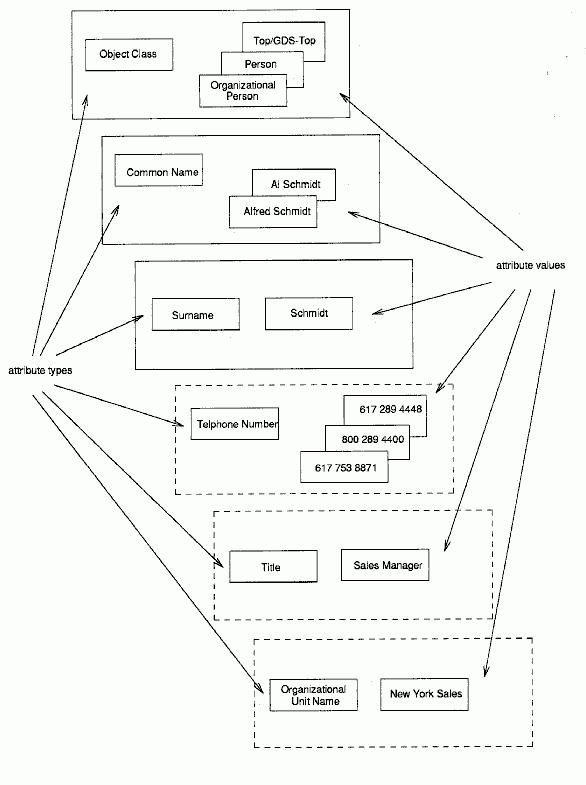 In summary (as shown previously in the figure, The Structure of the DIB), the DIB is made up of entries, each of which contains information about objects. Entries consist of attributes; each attribute has a type and one or more values.