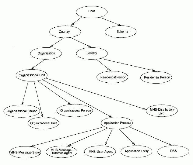 For example, the object class Organization (abbreviated with the acronym ORG in the SRT) has a superior rule number of 2, indicating that it is located in the DIT beneath the object class Country (C), which has a rule number of 2. Organization Unit (OU) is located beneath Organization because it has a superior rule number of 3 and so forth.