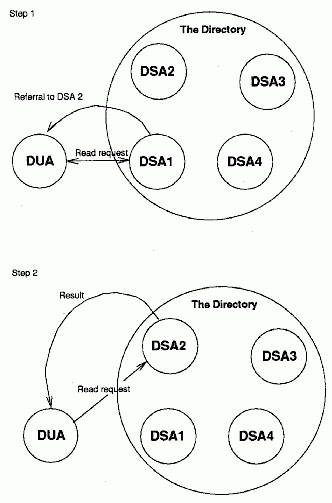 The following figure shows an example of a referral. DSA1 passes a referral to DSA2 back to the DUA. The DUA then makes a request to DSA2.