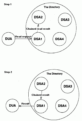 If a request received from a DUA cannot be fulfilled by the receiving DSA, that DSA can send a referral back to the initiating DUA over DAP. Alternatively, the DSA can chain the request over DSP, asking another DSA to perform the requested function. That DSA can perform the function or can send back a referral of its own. In either case, the first DSA eventually responds to the originating DUA with either the results of the completed operation or a referral.