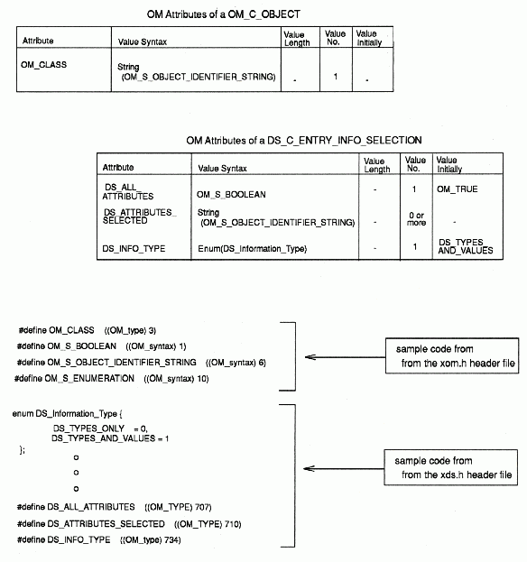 The tables in the following figure show the OM attributes, syntax, and values for the OM class DS_C_ENTRY_INFO_SELECTION, and how the integer values are mapped to corresponding names in the xom.h and xds.h header files. The topics in Part 4 of this guide contain tables for every OM class supported by the directory service. Refer to XDS Class Definitions for a complete description of DS_C_ENTRY_INFO_SELECTION and the accompanying table.