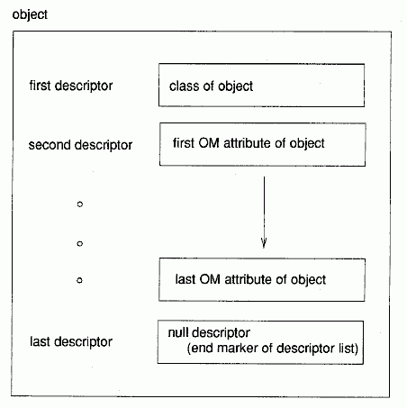 The following figure shows the representation of a public object in a descriptor list. The first descriptor in the list indicates the object's OM class; the last descriptor is a NULL descriptor that signals the end of the list of OM attributes. In between the first and the last descriptor are the descriptors for the OM attributes of the object.