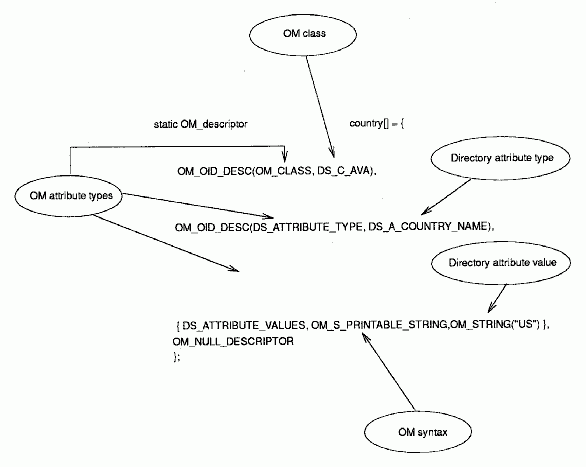 The second descriptor defines the first OM attribute type, DS_ATTRIBUTE_TYPE, which has as its value DS_A_COUNTRY_NAME and syntax OM_S_OBJECT_IDENTIFIER_STRING.