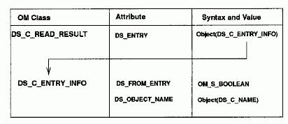 For example, as shown in the following figure, the OM class DS_C_READ_RESULT has one OM attribute: DS_ENTRY. The syntax of DS_ENTRY is OM_S_OBJECT with a value of DS_C_ENTRY_INFO, indicating that it points to the subobject DS_C_ENTRY_INFO. DS_C_ENTRY_INFO has the OM attribute DS_OBJECT_NAME with the syntax OM_S_OBJECT, indicating that it points to the subobject DS_C_NAME.