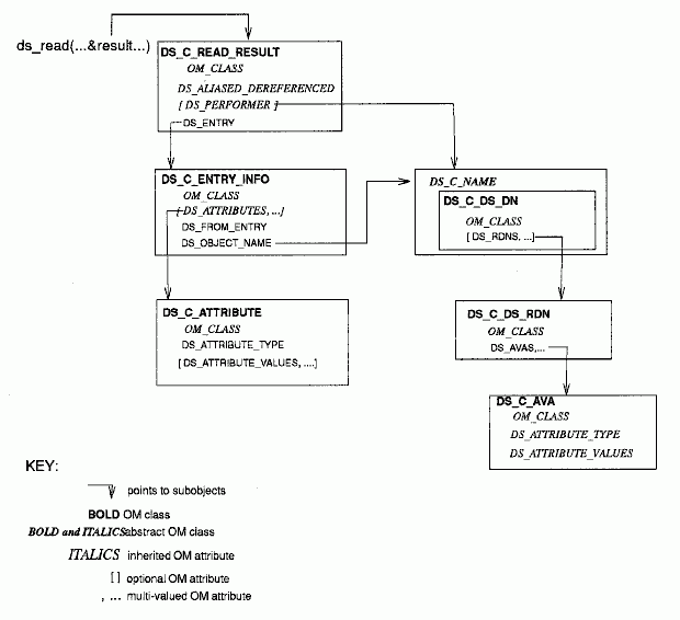The OM class returned by ds_read( ) is DS_C_READ_RESULT. The OM class returned by the ds_compare( ) call is DS_C_COMPARE_RESULT, and so on. (Refer to the reference pages in the OSF DCE Application Development Reference for a description of the OM classes associated with a particular function call; refer to XDS Class Definitions for full descriptions of the OM attributes, syntaxes, and values associated with these OM classes.)