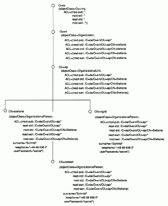 For example, the following result means that the entry /C=de/O=sni is a master copy, and that the user who is making the request (/C=de/O=sni/OU=ap/CN=norbert) has write access to its public attributes, read access to its standard attributes, and no accesss to its sensitive attributes: