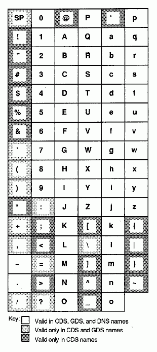 Note: Because CDS, GDS, and DNS all have their own valid character sets and syntax rules, the best way to avoid problems is to keep names short and simple, consisting of a minimal set of characters common to all three services. The recommended set is the letters A to Z, a to z, and the digits 0 to 9. In addition to making directory service interoperations easier, use of this subset decreases the probability that users in a heterogeneous hardware and software environment will encounter problems creating and using names.