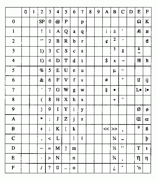 The following table shows the T61 graphical character set.