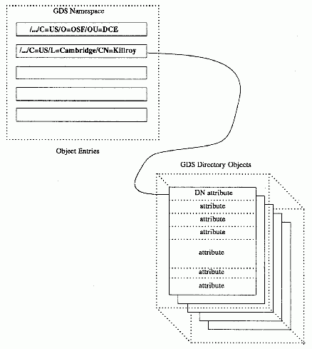 The GDS namespace is a hierarchical collection of entries. The name of each of these entries is an attribute of a directory object. The object is accessed through XDS by stating its name attribute.