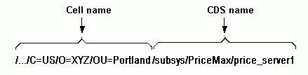 Global NamesAll entries in the Directory Service have a global name that is universally meaningful and usable from anywhere in the DCE naming environment. The prefix /... indicates that a name is global. A global name can refer to an object within a cell (named in CDS) or an object outside of a cell (named in GDS). The following example shows the global name for an entry created in GDS. The name represents user Ellie Bloggs, who works in the administrative organization unit of the Widget organization, a British corporation. /.../C=GB/O=Widget/OU=Admin/CN=Ellie Bloggs The GDS name syntax consists of a global prefix /... and a set of elements, called Relative Distinguished Names (RDNs). Each RDN consists of one or more pairs of parts separated by an = (equal sign) character. The items that are separated by an equal sign are multiple AVAs (Attribute Value Assertions). See the OSF DCE GDS Administration Guide and Reference for more information about AVAs. The first part of a pair is an abbreviation that indicates a type of information. Some common abbreviations are Country (C), Organization (O), Organization Unit (OU), and Common Name (CN). The second part of the pair is a value. (See GDS Names for more information on GDS names.) The following example shows a global name for a price database server named in CDS. The server is used by the Portland sales branch of XYZ Company, an organization in the United States.
