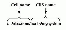 As the example illustrates, global names for entries that are created in CDS look slightly different from pure GDS-style names. The first portion of the name, /.../C=US/O=XYZ/OU=Portland, is a global cell name that exists in GDS. The remaining portion of the name, /subsys/PriceMax/price_server1, is a CDS name. The cell name exists because cells must have names to be accessible in the global naming environment. The GDA looks up the cell name in the process of helping CDS in one cell find a name in another cell. Cell names are established during initial configuration of the DCE components. Before configuring a cell that will participate in standard intercell communication (that is, via the DNS or GDS global directory services), the DCE administrator must obtain a unique cell name from either of the global naming environments, depending on whether the cell needs to be accessed through GDS or DNS. The next example shows the global name of a host at ABC Corporation. The global name of the company's cell, /.../abc.com, exists in DNS.