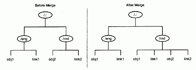 The following figure shows the structure of the example namespace before and after the merge operation in our example.