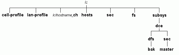 Types of Cell Namespace EntriesThe following topics describe the different types of entries that comprise the cell namespace. These entries are created when you follow the default configuration path described in Part 2. The OSF DCE Administration Guide - Core Components, the OSF DCE GDS Administration Guide and Reference, and the OSF DCE DFS Administration Guide and Reference provide details about the names that the DCE components use. The cell namespace can be divided into three major parts: · The CDS part of the namespace · The Security part of the namespace · The DFS part of the namespace (the filespace) · The dced (per host) part of the namespace Each of the DCE services maintains its own namespace within the cell namespace. DFS maintains its own namespace to ensure consistency among many files. The Security Service maintains its own namespace to ensure that the DCE cell remains secure. Clients of these two services query CDS for binding information that enables them to find Security or DFS servers. The points where the binding information is stored serve as mount points in the CDS namespace for the namespaces that DFS and the Security Service manage. This transition point between two namespaces is called a junction. The /.:/sec directory is the junction from the CDS part to the Security part of the cell namespace, and the /.:/fs directory is the junction from the CDS part to the DFS part of the cell namespace. The junction /.:/hosts/hostname/config is the junction from CDS to the dced (per host) part of the namespace. The following figure shows the top level of the cell namespace. In some cases the names in the cell namespace are fixed (or well known) and cannot be changed. In other cases you can choose a different name from the one listed. For more information about which names are well known, see the OSF DCE Administration Guide - Core Components. In the following figure, /.: and cell-profile are well-known names.