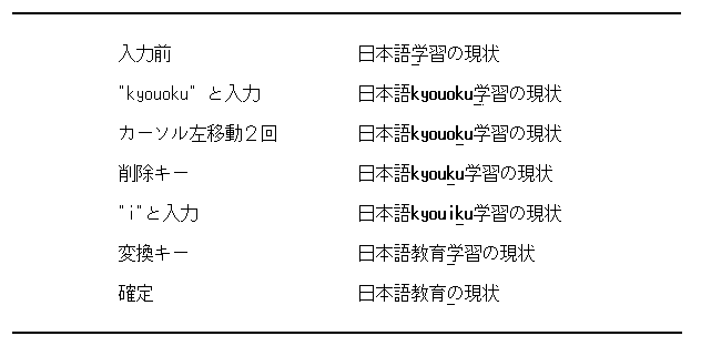 入力文字列編集において問題となる点のうち, 自動ローマ字かな変換を行っているときに限定される点については, 第2.3.9項で説明します。この節では, 入力文字列編集について一般的な説明を行います。