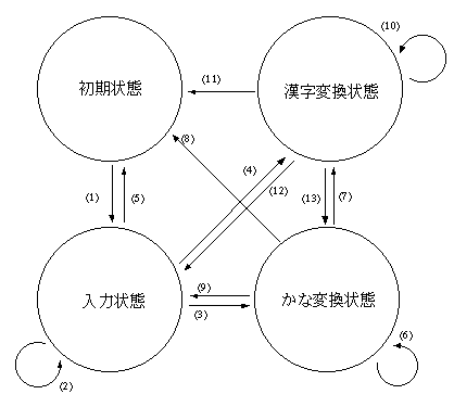 図 4-1に示される4つの丸は内部状態を表し, それらをつなぐ矢印は状態間の遷移を示します。内部状態には,「初期状態」, 「入力状態」,「かな変換状態」,「漢字変換状態」があります。 それぞれの状態の意味を以下に示します。