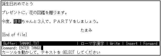 | "たまみ" | [Tab]キーを押すと, 通常では8カラムずつカーソルが右へ移動します。これは8カラムごと (8カラム目,16カラム目,24カラム目...)に,タブがセットされているためです。 1〜7カラム目にカーソルがあるときに[Tab]キーを押すと8カラム目に, 9〜15カラム目にカーソルがあるときには16カラム目にカーソルが移動します。 たとえば,12カラム目にカーソルがあるときに[Tab]キーを押すと, 16カラム目にカーソルが移動します。適切な位置になるまで[Tab]キーを押してから "たまみ"と入力し,[Return]キーで確定します。 |