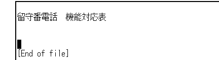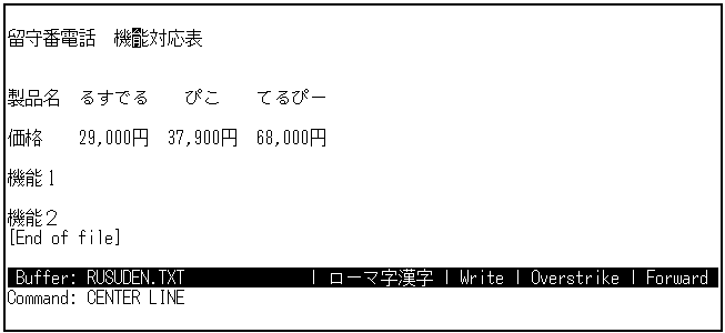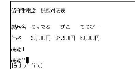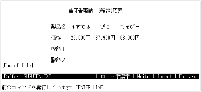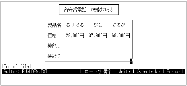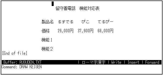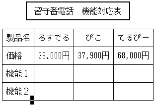 2行あけて,3行目にタイトルを入力します。 2行あけるのは,後で箱を書くためです。まず,"留守番電話"と入力し, 2カラム移動して"機能比較表"と入力します。確定したら, [Return]キーを3回押して,製品名の行との間に2行あけます。2行あけるのは, 後で箱を書くためです。