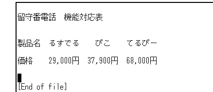 表の1行目には製品名が入ります。 "製品名"と入力してから2カラム移動して,"るすでる",4カラム移動して"ぴこ", 4カラム移動して"てるぴー"と入力します。カラム数を空けて入力するのは, 出来上がりをきれいにするためです。確定したら, [Return]キーを2回押して1行あけます。1行あけるのは,後で罫線を書くためです。