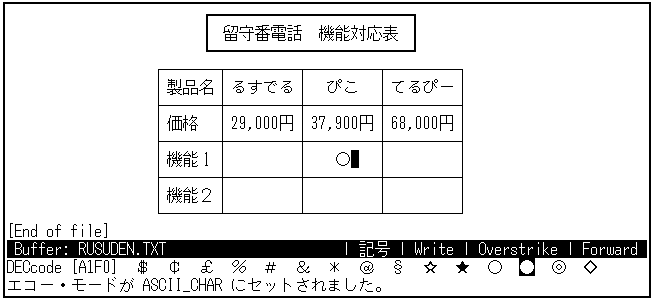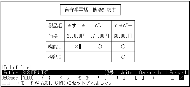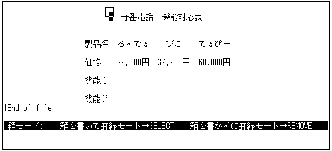 日本語EVEの DRAW KEISEN コマンドを実行し,箱モードを使用します。 さきほどセンタリングした"留守番電話 機能比較表"を, 太い枠の箱で囲んでみましょう。
