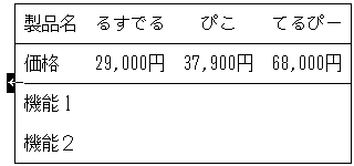 "機能1"と"機能2"は,それぞれ"機"にカーソルを置いてスペース・バーを押し, "製品名","価格"と位置をそろえてください。