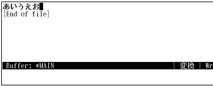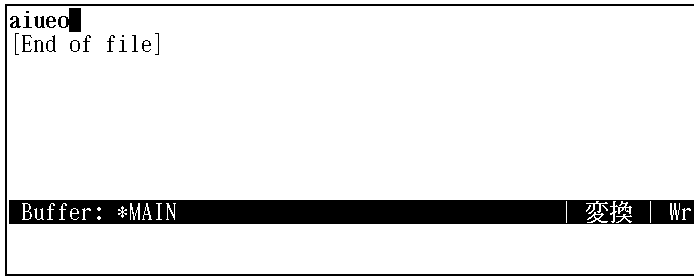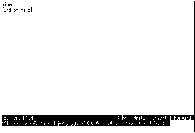 日本語EVEの起動時にファイル名を指定しなかったため, バッファの内容を書き込むファイル名を尋ねてきています。ここでは, 練習のために,ちょっと文字を入力してみただけなので, ファイルには書き込みません。[Return]キーだけを押してください。 ファイルに書き込まずに日本語EVEを終了します。