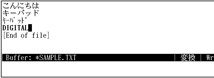 ここで,変換キーを押したあとも, 入力文字列が高輝度表示されたままなのに注目してください。入力文字列は, 変換が確定されるまで(高輝度表示されている間)は,何度でも変換可能です。 DIGITALが高輝度表示された状態で,[Ctrl/H],[Ctrl/K],[PF1]→[Ctrl/K], [Ctrl/F])と順番に押してみて,変換されることを確認してください。