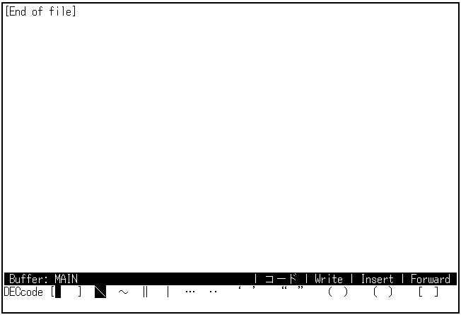 記号を入力するモードです。画面の下のほうにDEC漢字コード一覧表が表示され, 矢印キー([↑],[↓],[→],[←])で上下左右にカーソルを移動します。 [Return]キーを押すと,カーソルが置かれている記号を現在のバッファに入力できます。 記号モードを終了してローマ字漢字/カナ漢字モードに戻るには, [F10]キーを押してください。