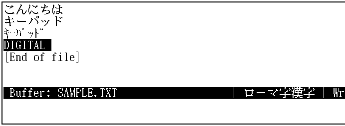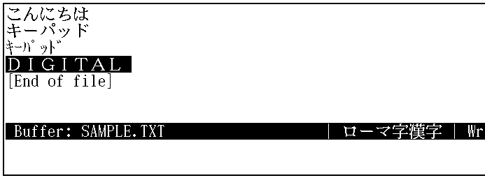 ここで,変換キーを押したあと,入力文字列が反転表示に変わったのに 注目してください。入力文字列は,変換が確定されるまで(反転表示されている間)は, 何度でも変換可能です。DIGITALが反転表示された状態で,[F11],[F12], [F13],[F14])と順番に押してみて,変換されることを確認してください。
