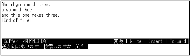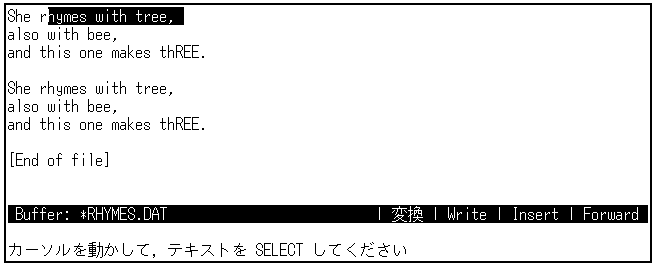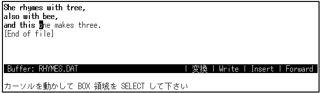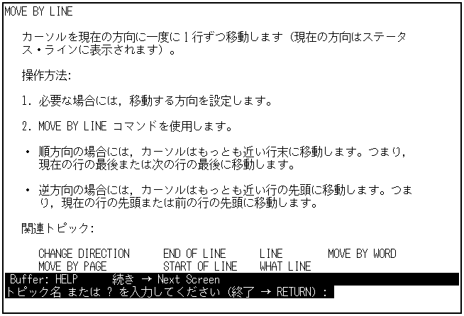 MOVE BY LINE コマンドを実行すると,カーソルは, 行末を下へ移動します。CHANGE DIRECTION コマンドを実行すると, 現在のバッファの方向が,逆方向に変更されます。このコマンドの後で, 再び MOVE BY LINE コマンドを実行すると,カーソルは行頭を上へ移動します。