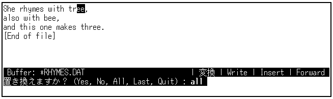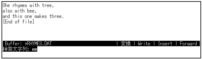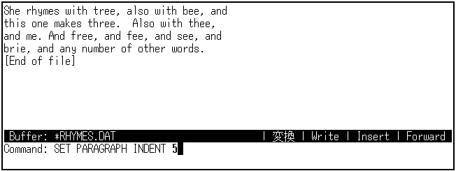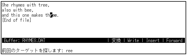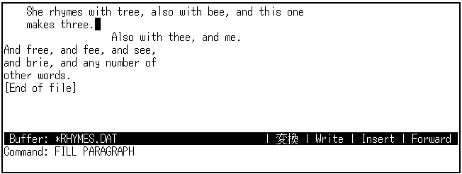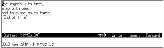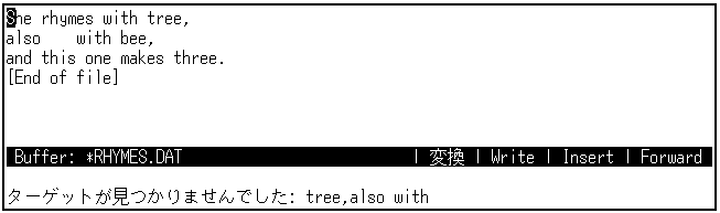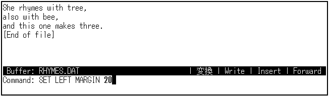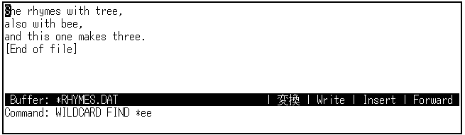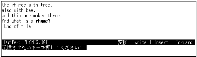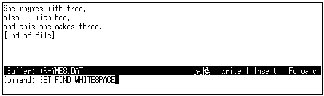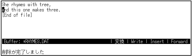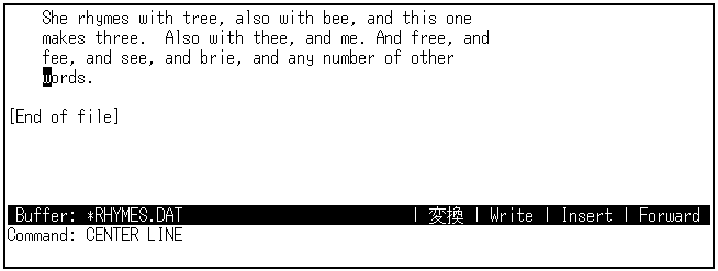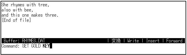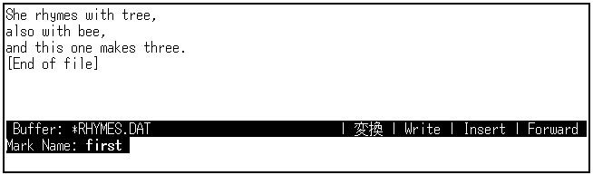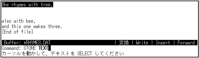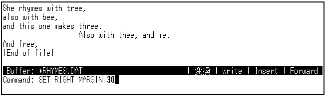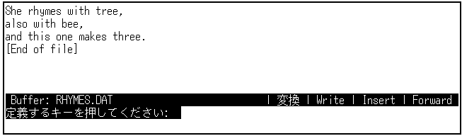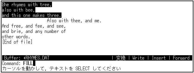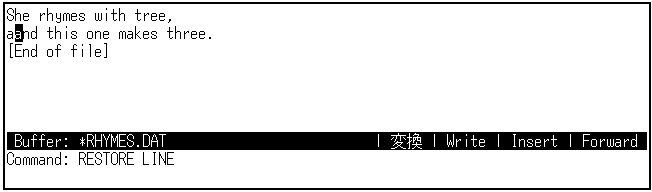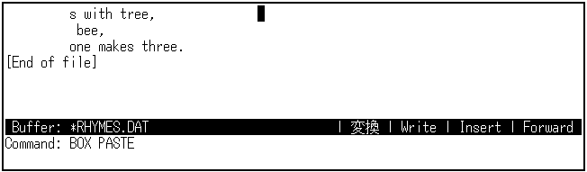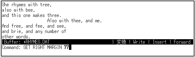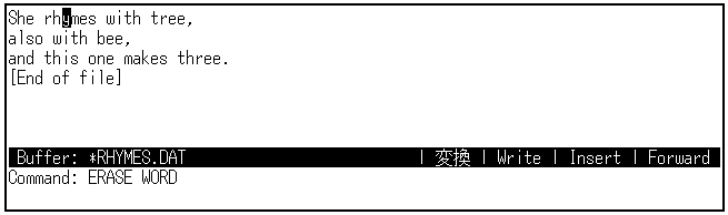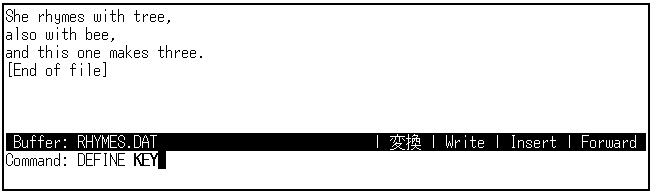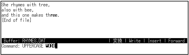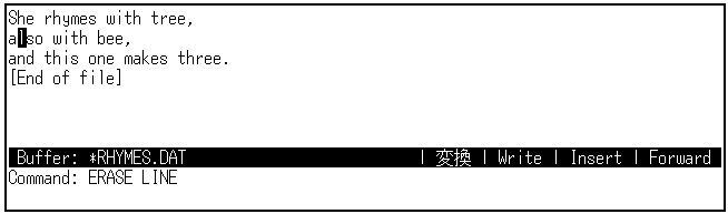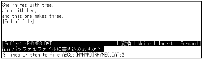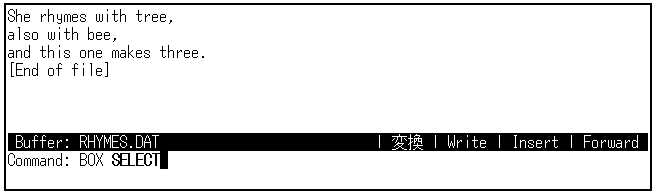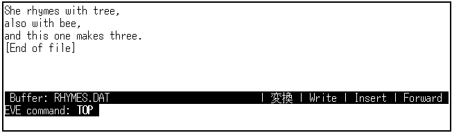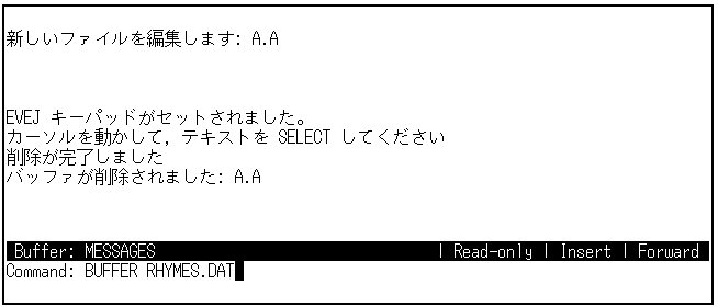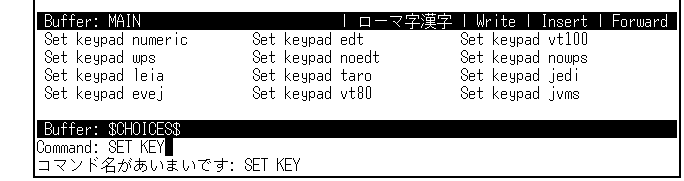 短縮形を区別できる十分な文字をタイプし,[Return]キーを押すと, そのコマンドが実行されます。また,バッファ名,ファイル名, および MARK コマンドのラベル名も,同様に省略することができます。 これらの場合も,短縮形があいまいなときには, 日本語EVEは対応するもののリストを表示します。