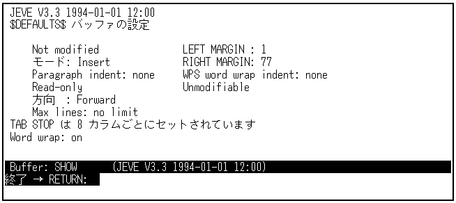 日本語EVEでは,ユーザが作成した新しい各バッファは,編集モード,方向, マージン,およびタブ・ストップに関して,省略時の設定を使用します。 $DEFAULTS$というシステム・バッファには,省略時のバッファ属性が登録されています。