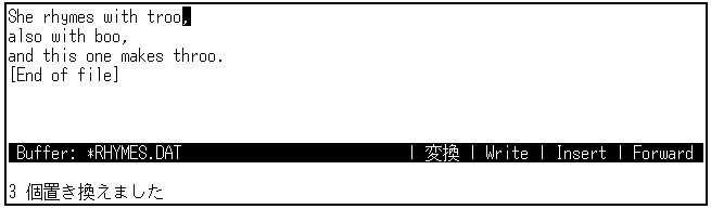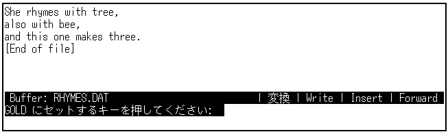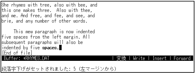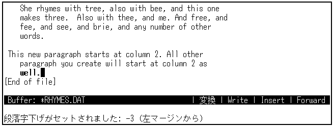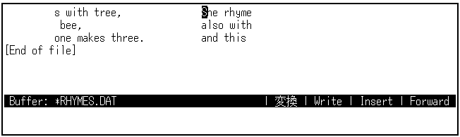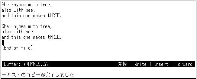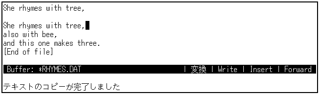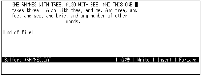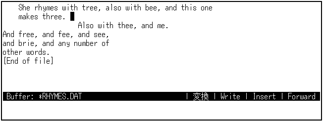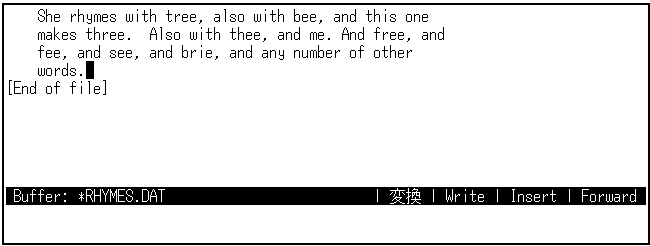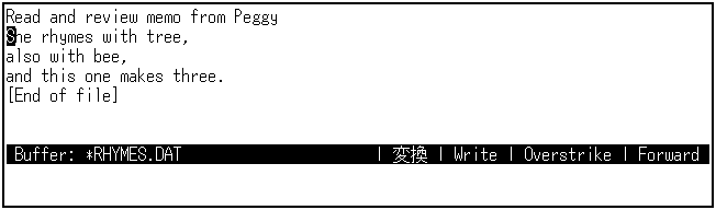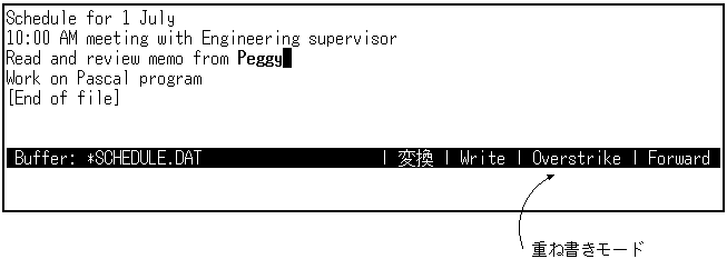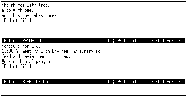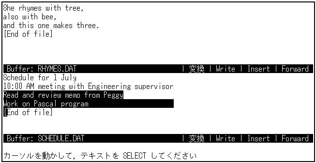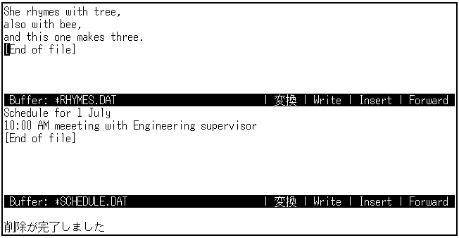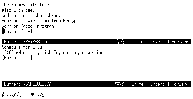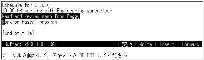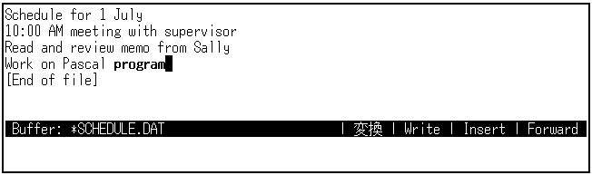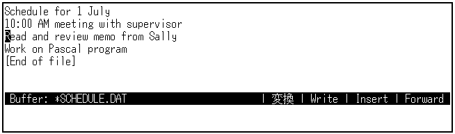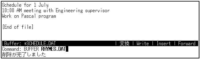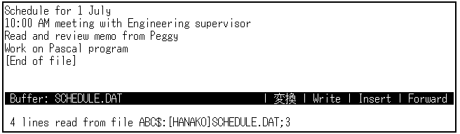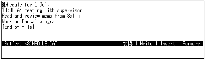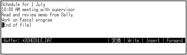 日本語EVEは,カーソルをバッファの先頭に移動し, ユーザがテキストを入力するのを待ちます。次に示すテキストを SCHEDULE.DATファイルに入力すると, [End of file]マーカはバッファ内で下に移動します。