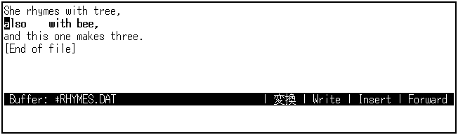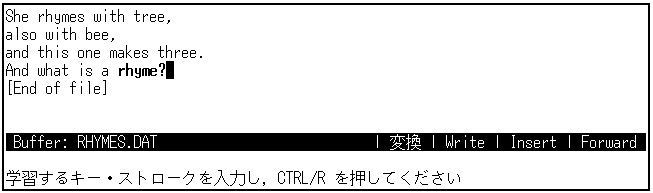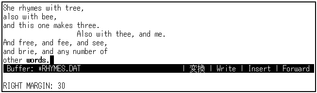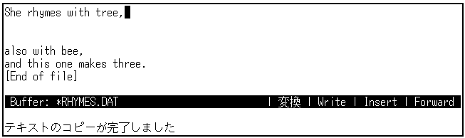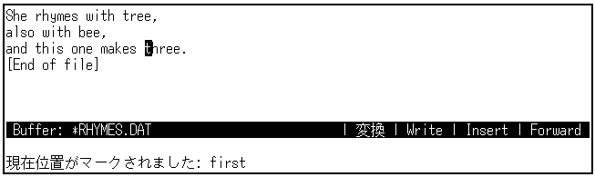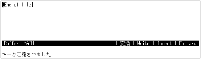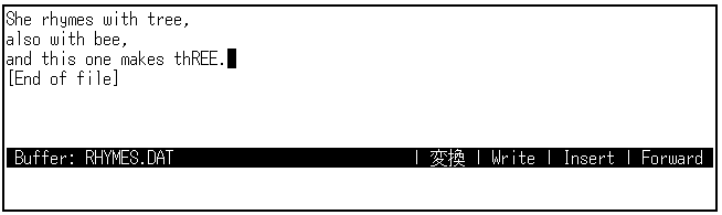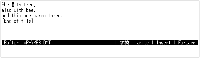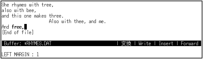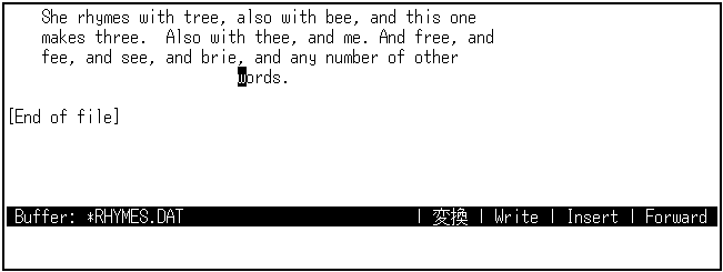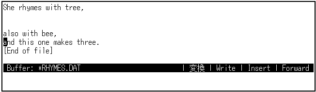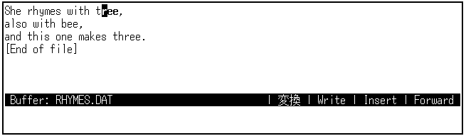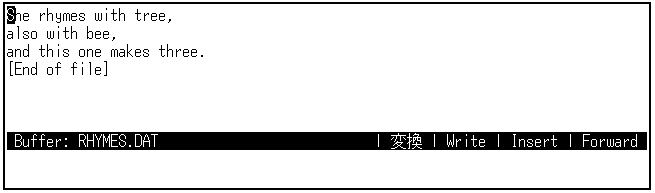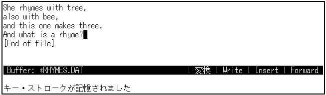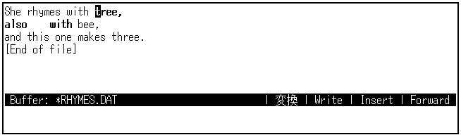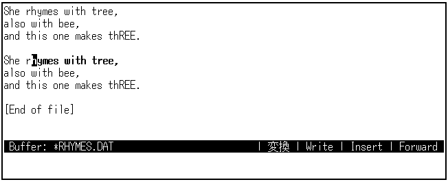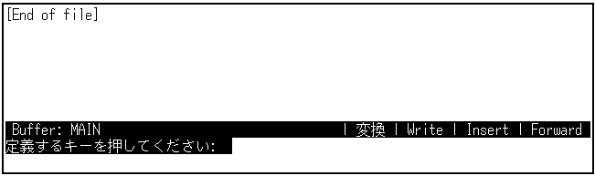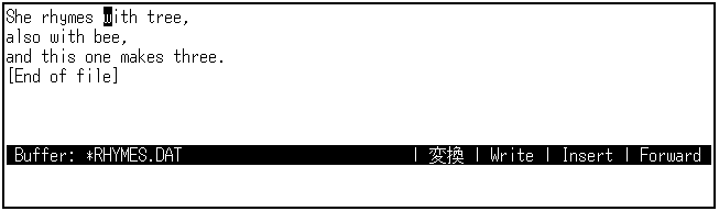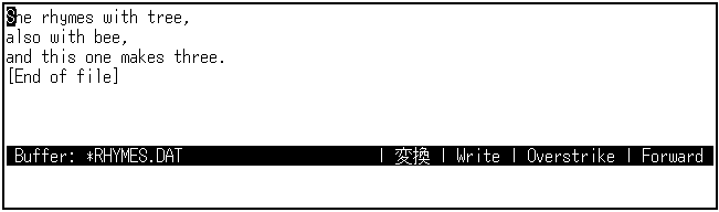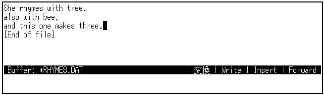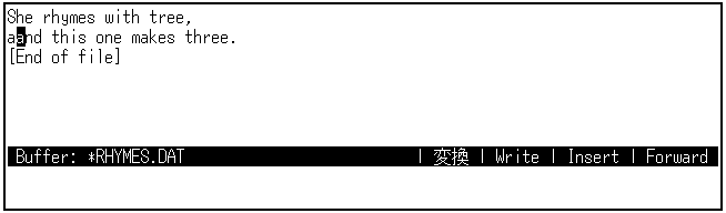 キーボードから文字をタイプ入力できます。日本語EVEは, バッファの現在のモード(挿入モード/重ね書きモード)にしたがって, バッファの現在のカーソルの位置に文字を追加します。