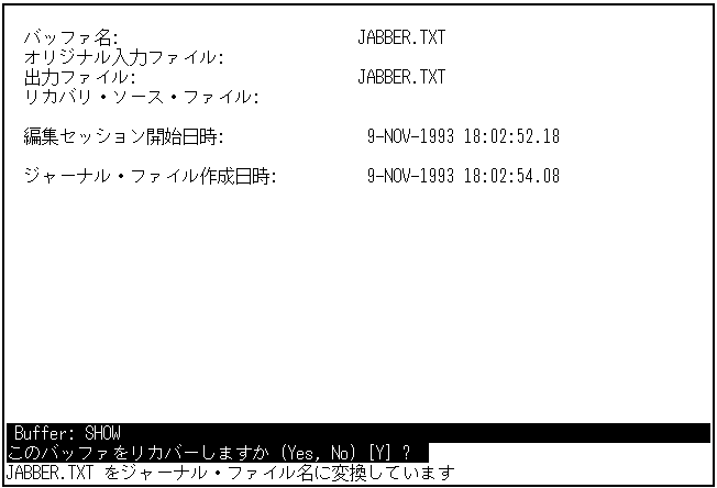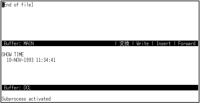 編集セッションを再開するには,DCLのATTACHコマンドとサブプロセスのプロセス名 ("username_1")を使用して,編集サブプロセスに再接続します。 日本語EVEは編集セッションを再開し, カーソルは親プロセスに接続する前の位置に表示されます。