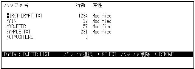 | BUFFER | 指定したバッファを現在のウィンドウに表示し, カーソルをそのバッファでのもとの編集位置に移動する。 指定したバッファが存在しない場合は,新しいバッファを作成し, バッファの先頭にカーソルを移動する。 |