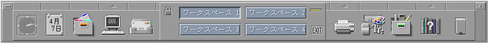 フロントパネル(図 1-2)は,アプリケーションへの高速アクセスを実現しています。 ユーザがカスタマイズしたワークスペースのいずれかをフロントパネルから選択したり, アイコンで表示されているアプリケーションを起動することができます。 選択ならびに起動は,ワークスペースのアイコンまたはアプリケーション・ アイコンをマウスでシングル・クリックするだけで実行できます。 すべてのワークスペースについて,図 1-2 と同様のフロントパネルが表示されます。