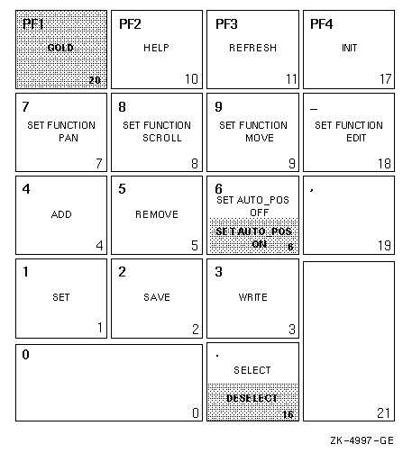 キーパッドの2列目のSET FUNCTIONキーは,指定した機能を実行するように, 矢印キーを再定義します。SET FUNCTIONコマンドを使用すると,矢印キーをEDIT からPAN,SCROLL,MOVEのいずれかに再設定できます。たとえば,SET FUNCTION SCROLL キーを押すと,上向き矢印キーはSCROLL UP 1 に,下向き矢印キーはSCROLL DOWN 1に,右向き矢印キーはSCROLL RIGHT 1に,左向き矢印キーはSCROLL LEFT 1にそれぞれ再定義されます(各コマンドの詳細については, 第18章のコマンドの部分を参照してください) 。